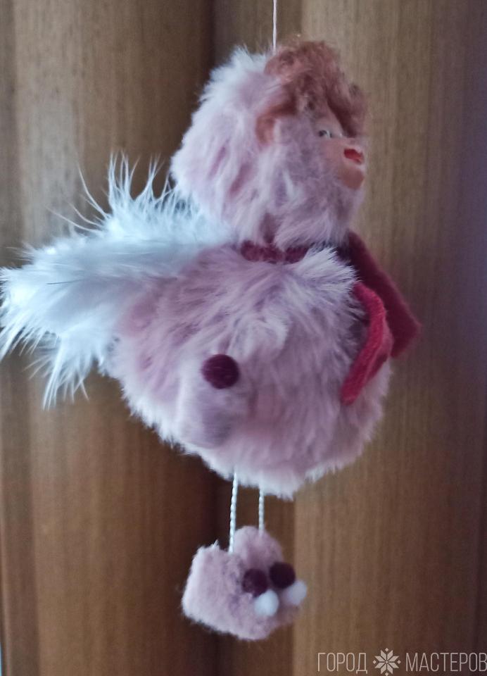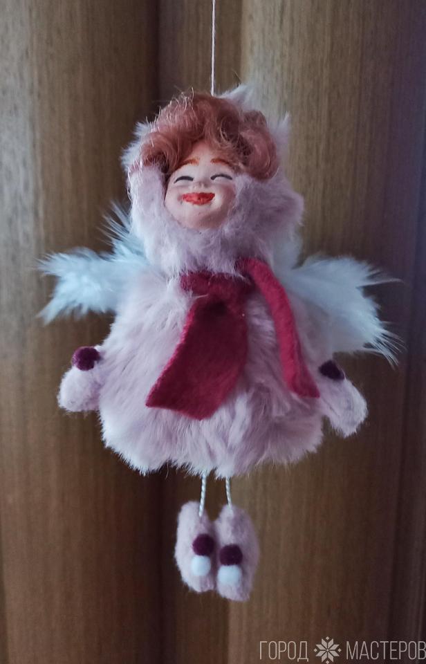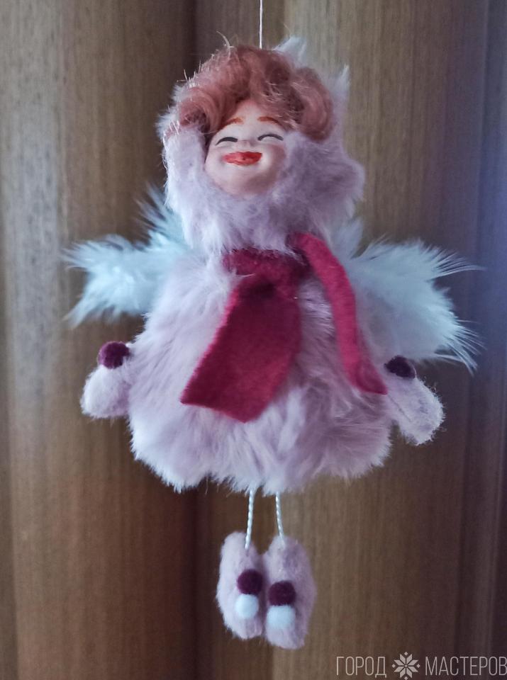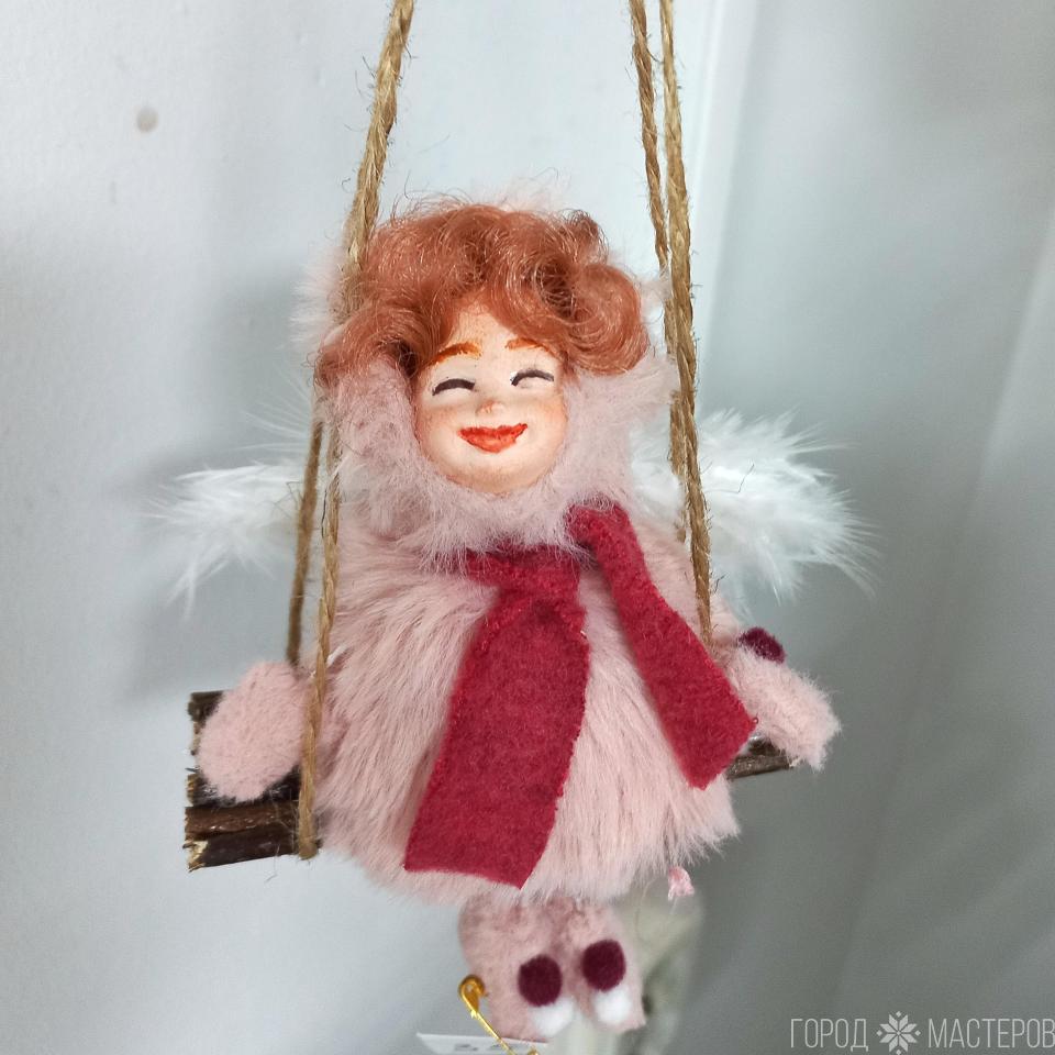 Коллекционный ангел ростом 20 см, уверенно сидит на полочке свесив ножки. Кукла текстильная, одежда не снимается, не стоит, только сидит. Утяжелен металлическим гранулятом. Обувь из нат.кожи, крылья из ваты твердые.