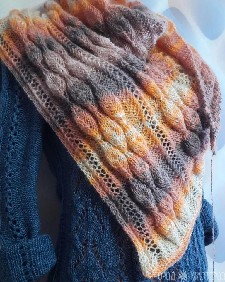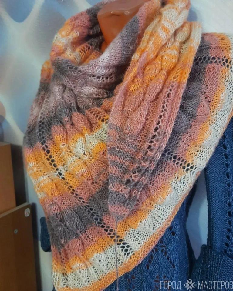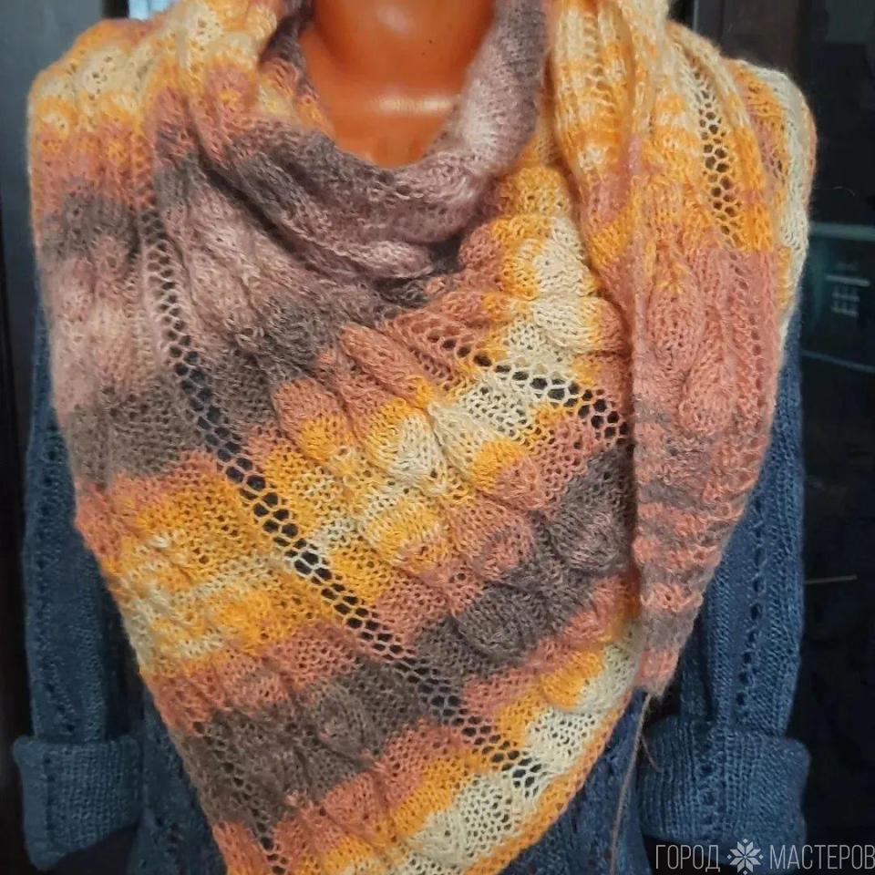 Ассиметричный бактус или шейный платок, Данная работа была выполнена из пряжи в составе которой 20 % шерсть, 80 % акрил. Сезон - весна, осень, легкая зима. Возможен выбор цвета, размера, узора. Цена указана за работу, без учета стоимости пряжи. Размер 1.47 х 1.20 х 95, регулируемый