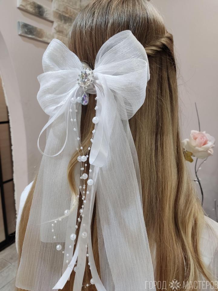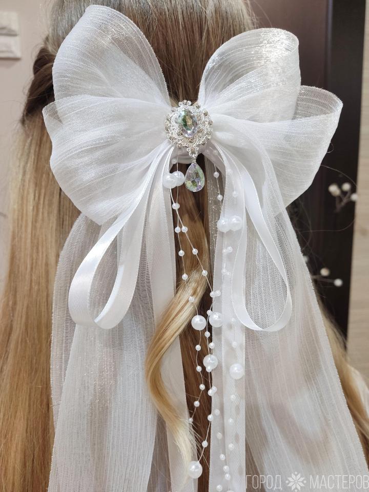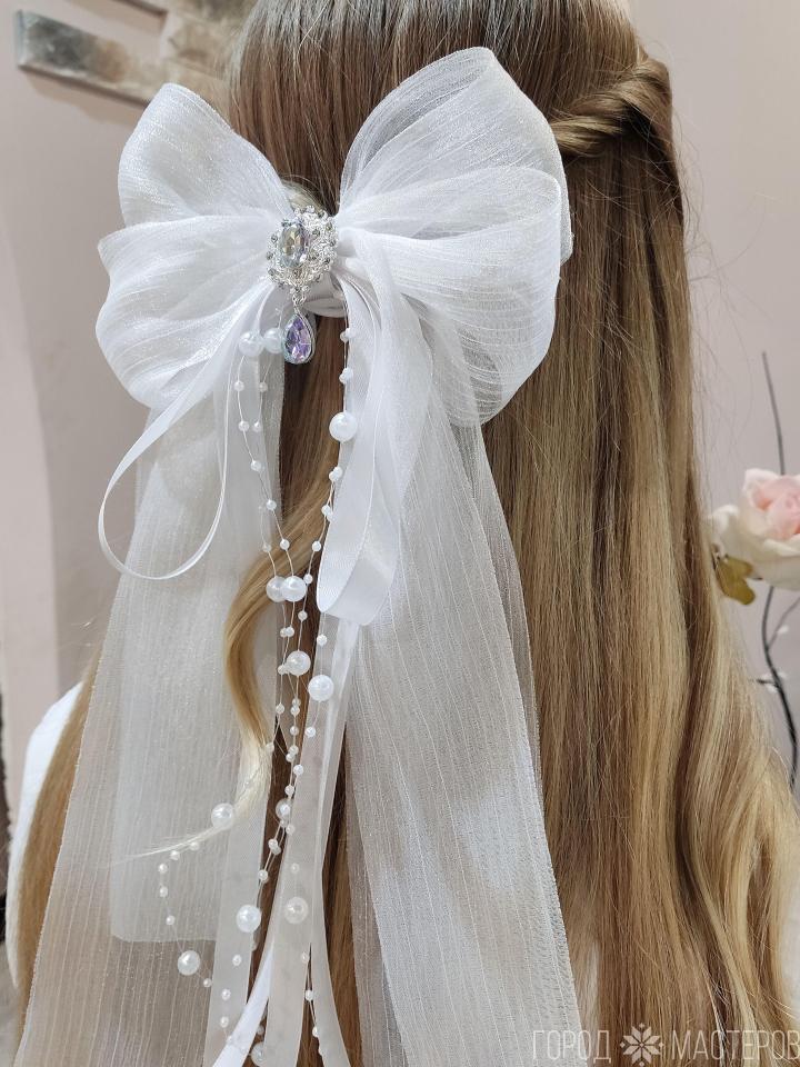 Очень нежный и нарядный бант, украшен бусинами на леске и ювелирной стразовой серединкой. Бант 14 см, длина хвостиков 29 см. Основа-резинка диаметром 4 см.
