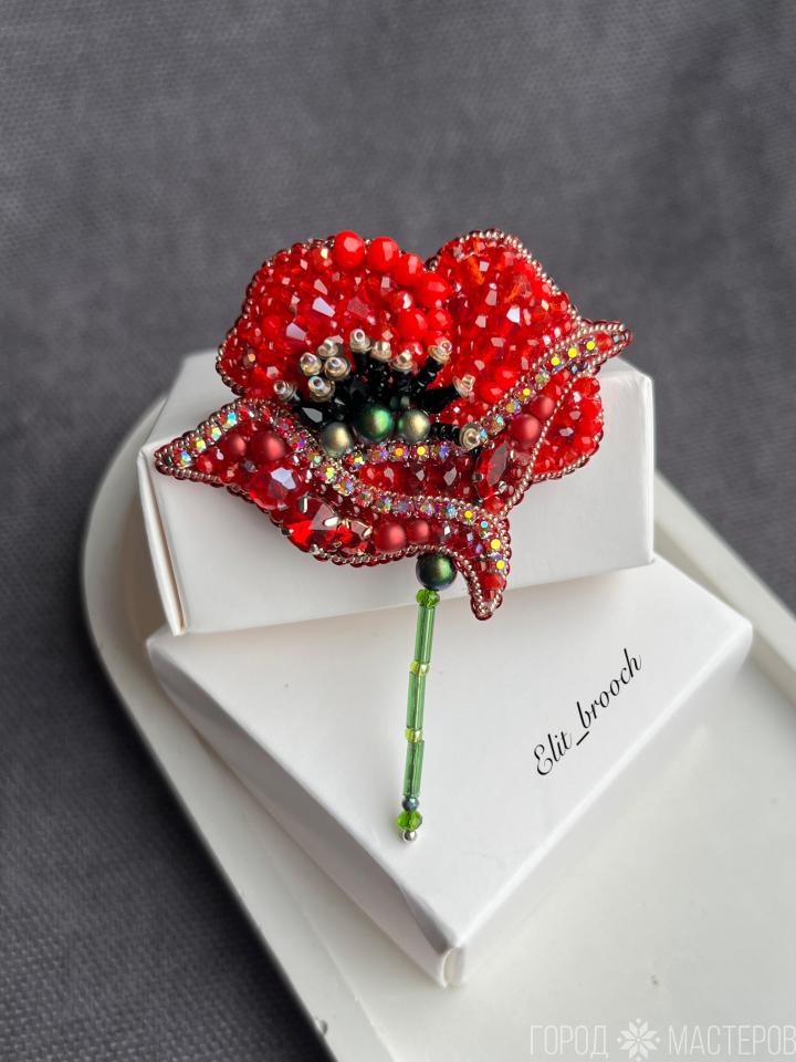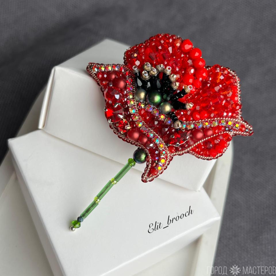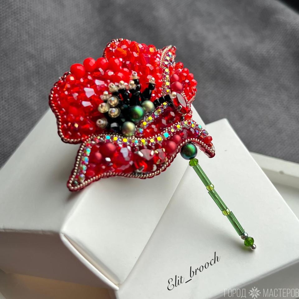 Брошь мак яркий стильный аксессуар. Выполненена из качественных материалов: кристаллов люкс, жемчуга Сваровски, японского и чешского бисера, стразовой цепочки, стеклянных бусин. Изнанка из натуральной кожи. Крепится японской булавкой. Брошь в подарочной коробочке. Размер 5,5 х5 см + 3 см ножка.