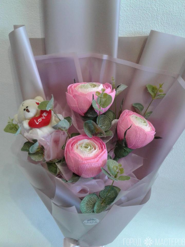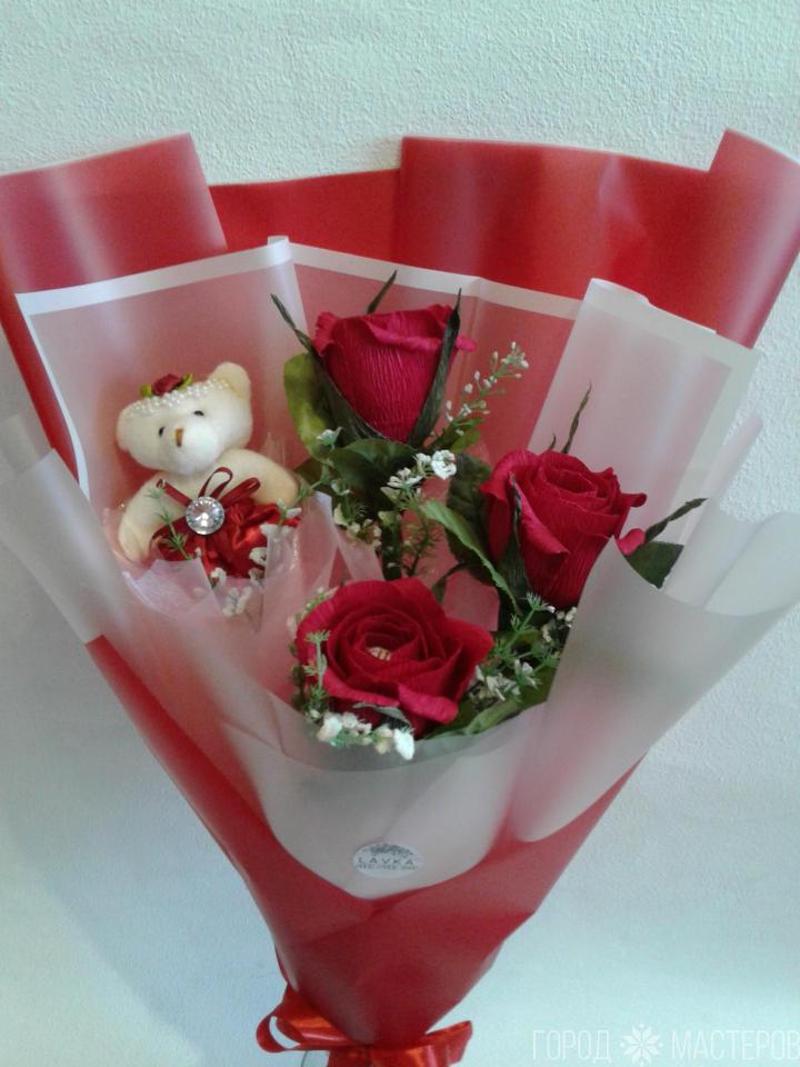 Такой необычный и неповторимый букет ручной работы, в технике Свит Дизайна, подарит любовь и нежность без слов. А еще в середине каждого цветка спрятан сюрприз -подарок( шоколадная конфета).