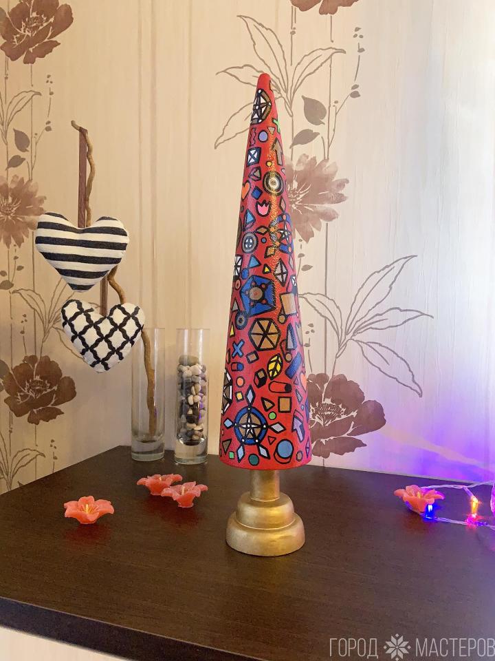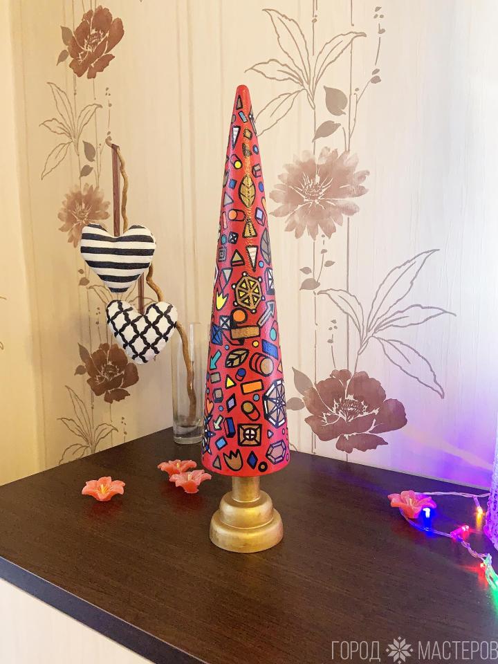 Дизайнерская ёлочка ручной работы из натурального дерева, высота 45 см. Декорирована росписью по дереву акриловыми красками в комикс стиле. Матовые краски, золотая и медная. Покрыта несколькими слоями лака для дерева, паркетным безвредным лаком.