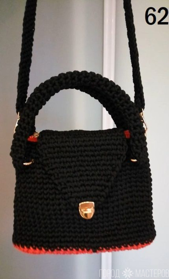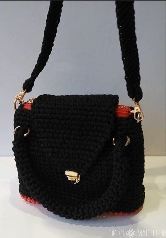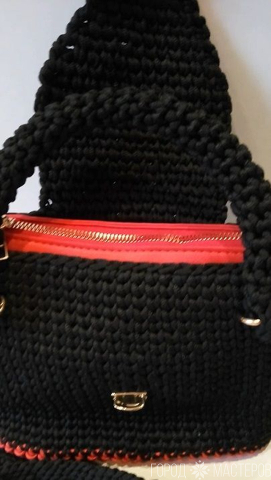 • #diy Сумочка с кожаным дном с подкладкой\ из шнура\ крючком.(красно - чёрная) - 1