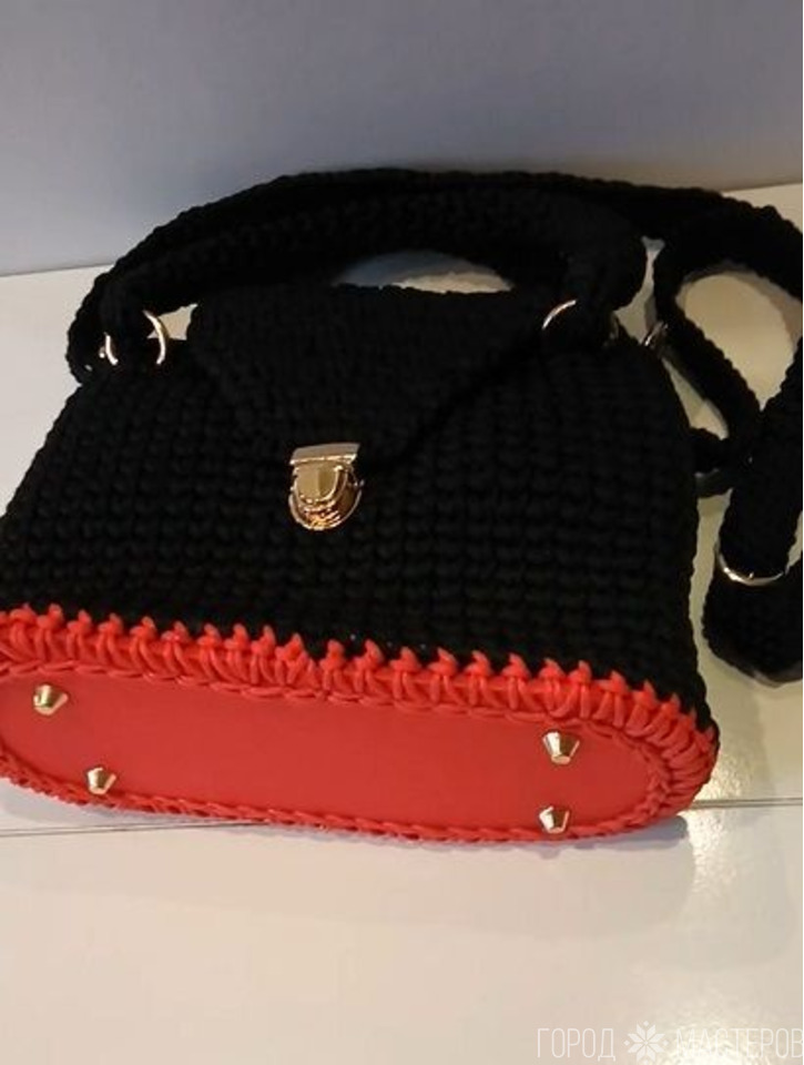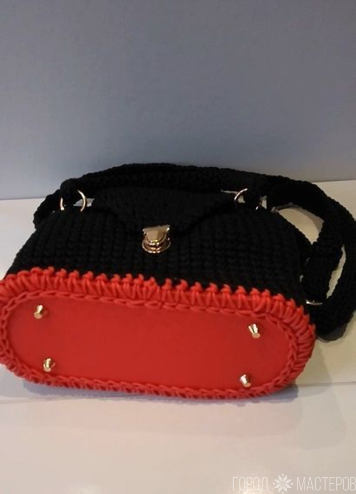 • #diy Сумочка с кожаным дном с подкладкой\ из шнура\ крючком.(красно - чёрная) - 2