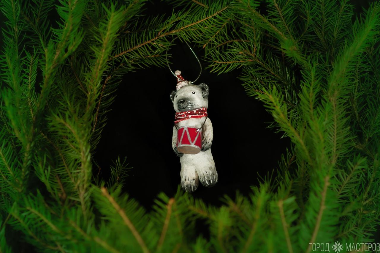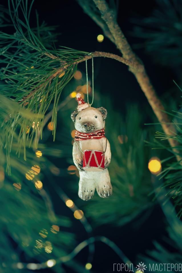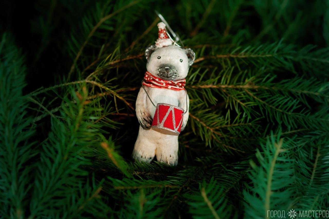 Самый зимний персонаж, белый мишка, ручной работы из ваты. Яркий и легкий декор для вашей новогодней елочки.