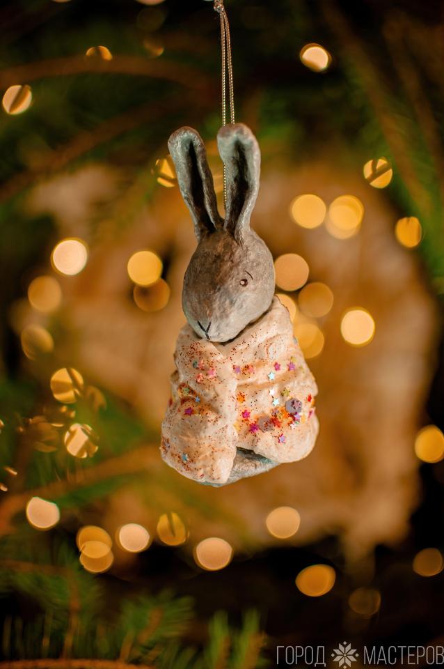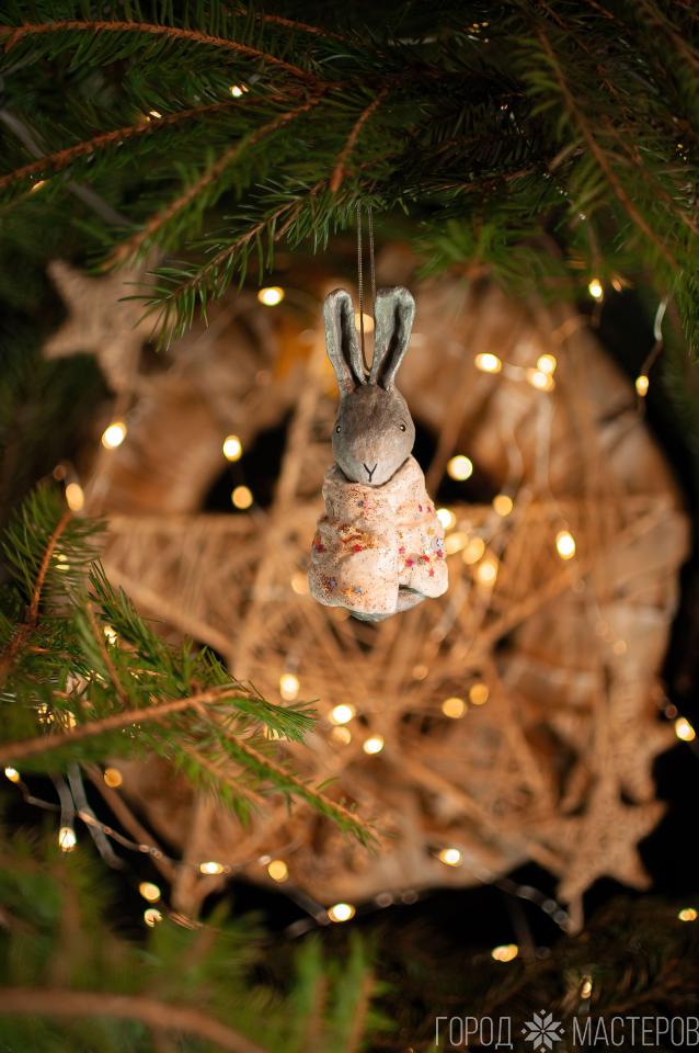 Милаха зайка в звездном одеяле, ручной работы из ваты. Яркий и легкий декор для вашей новогодней елочки.