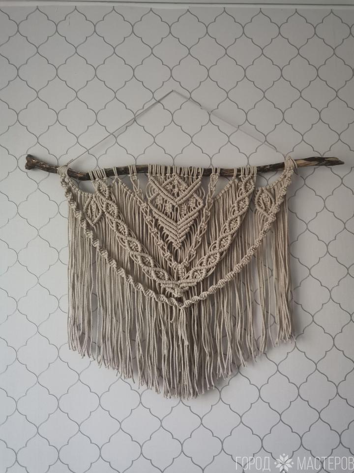 Гобелен в технике макраме. Размеры :ширина 110 см, высота от деревяшки до низа 73 см. Выполнен из натуральных материалов. Украсит интерьер в стиле бохо