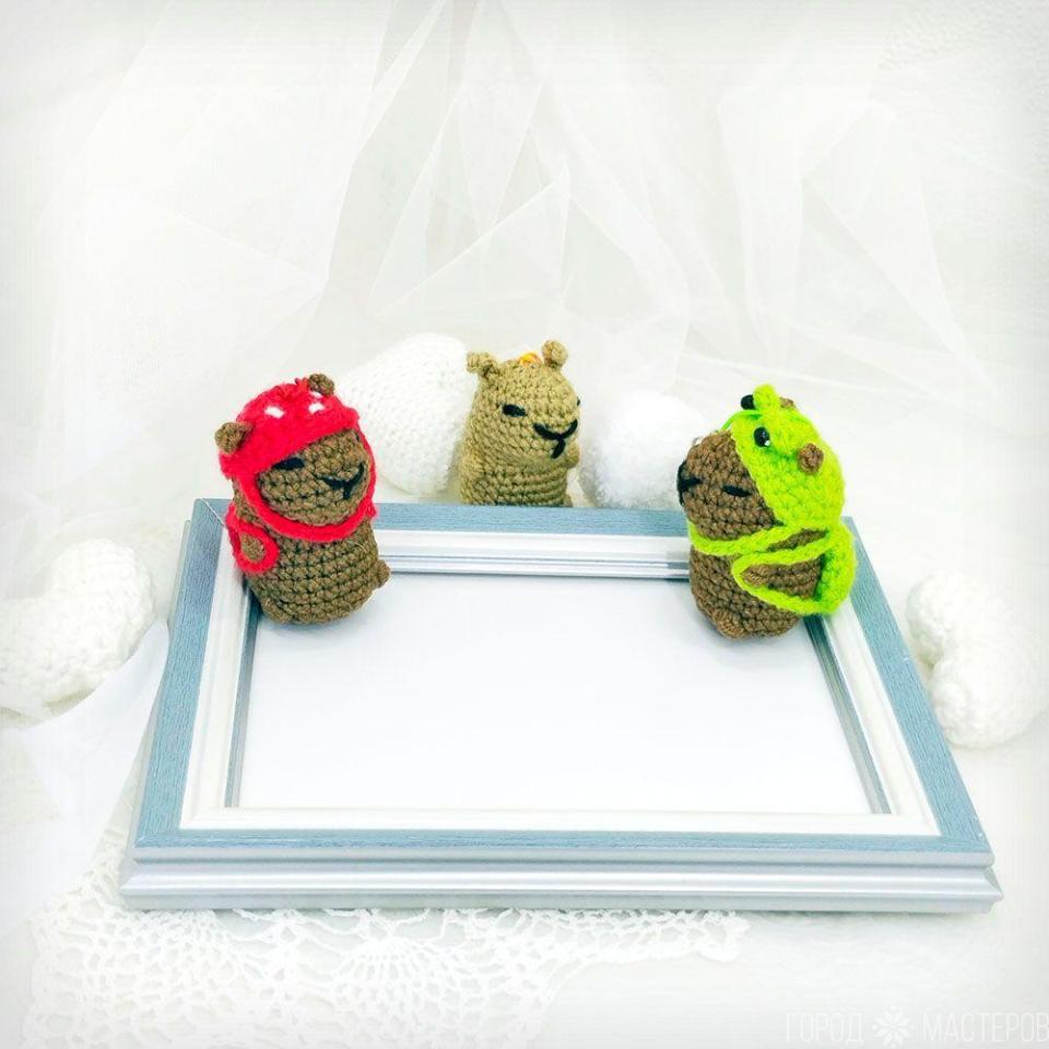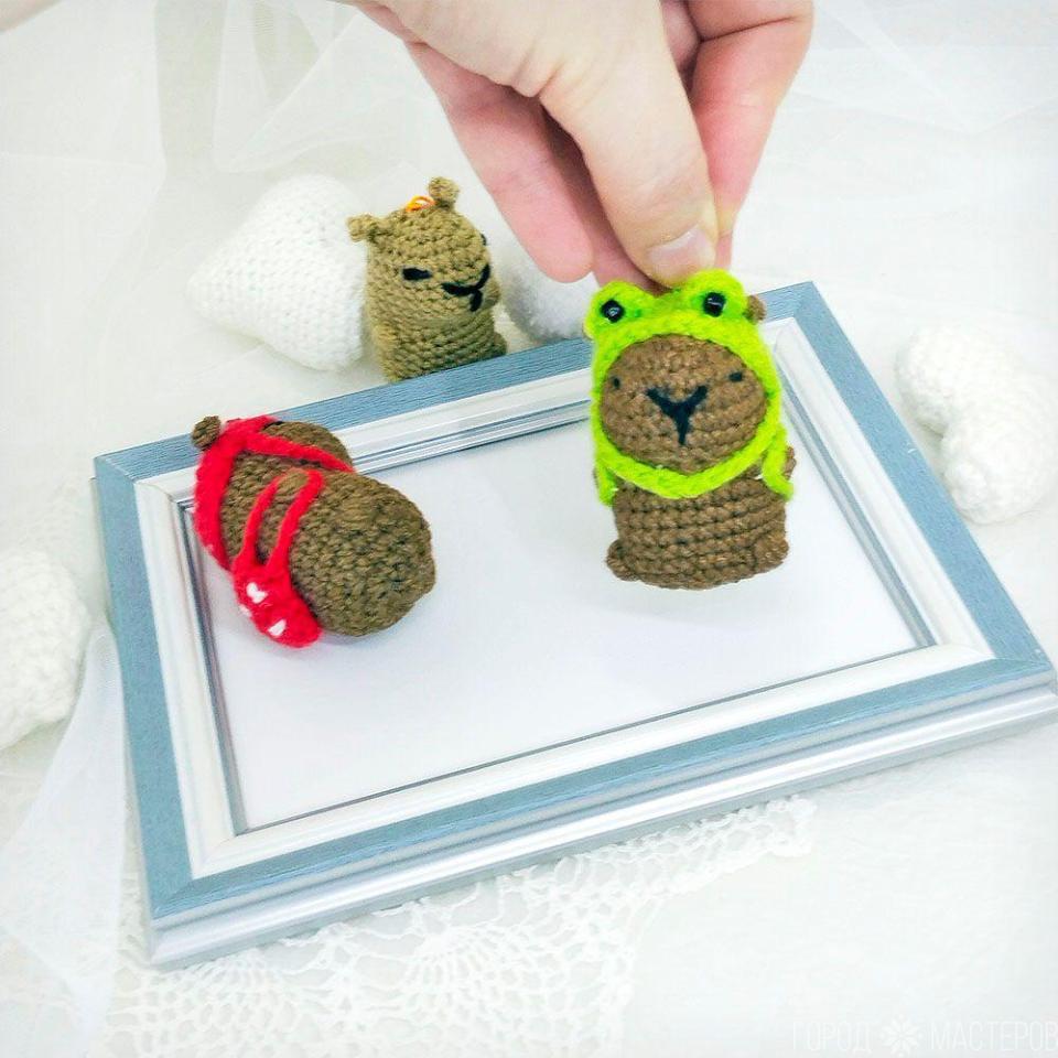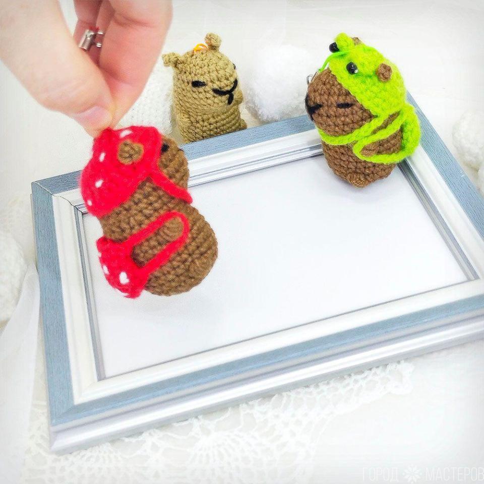 Я думаю, полезнее игрушек может быть только... мешок игрушек. Разных. В том числе и брелочков. Вон, смотрите, капибары уже ждут. Замаскировались в мухоморчик и лягушечку, рюкзачки натянули - собираются в путешествие, наверное. Любимый размерчик в 5 см прекрасно и компактно впишется и на ваш рюкзак, и на зеркало в вашей машине. Подвеска с карабином, закреплённым на двойное колечко поможет в этом.