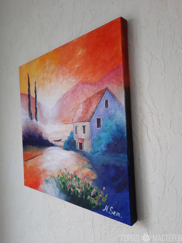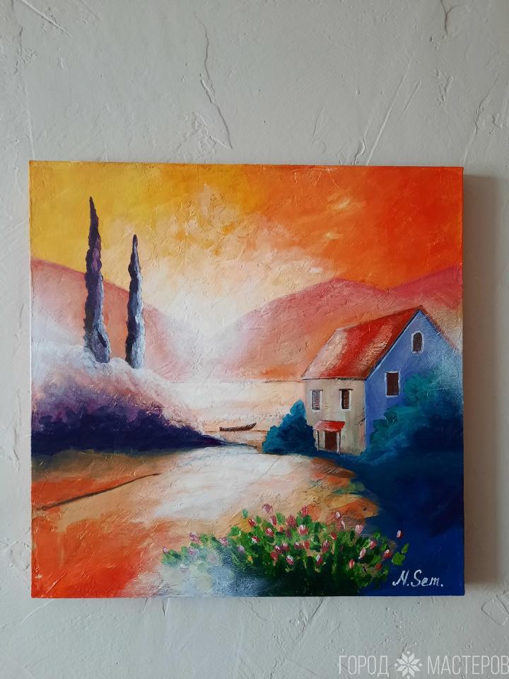 Картина "Южный закат" погружает нас в яркие краски летнего дня. Будет притягивать взгляд своей радостной палитрой.