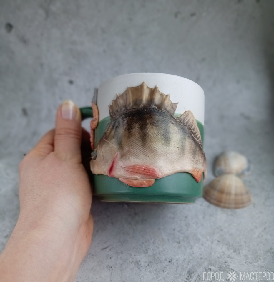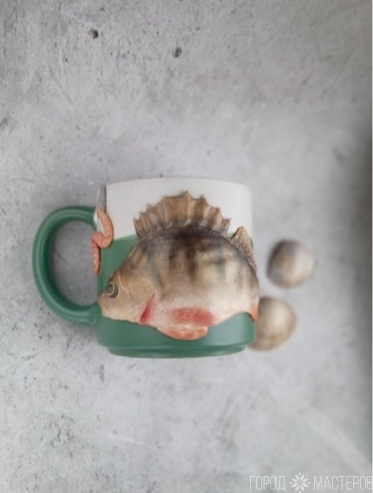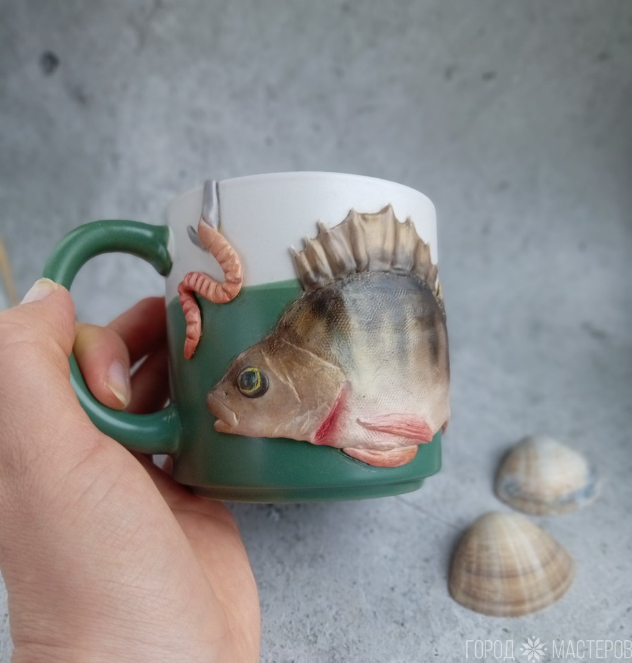 Хотите порадовать любителя рыбалки? Эта кружка именно для этого! Каждый элемент вылеплен мной вручную из качественной полимерной глины Cernit,и покрыт специальным глянцевым лаком для прочности