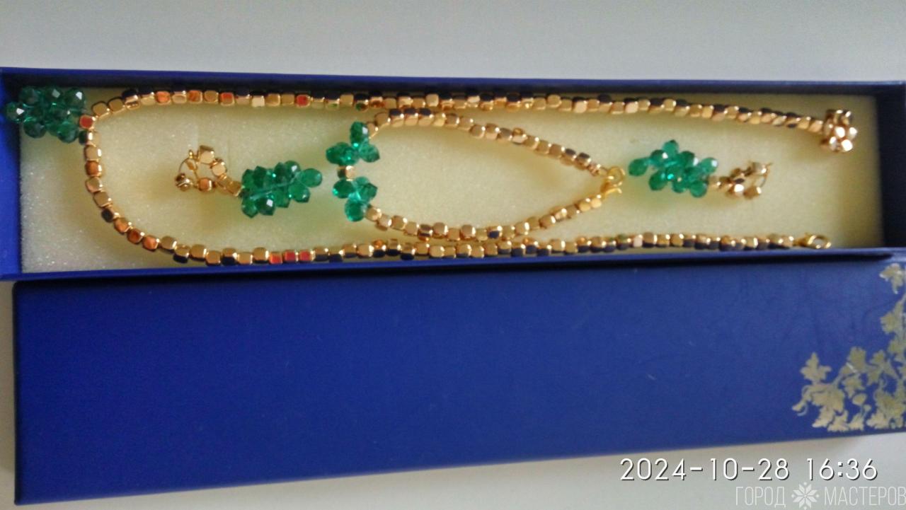 При желании комплект может быть упакован и праздничную коробочку ручной работы, инкрустированную жемчугом.