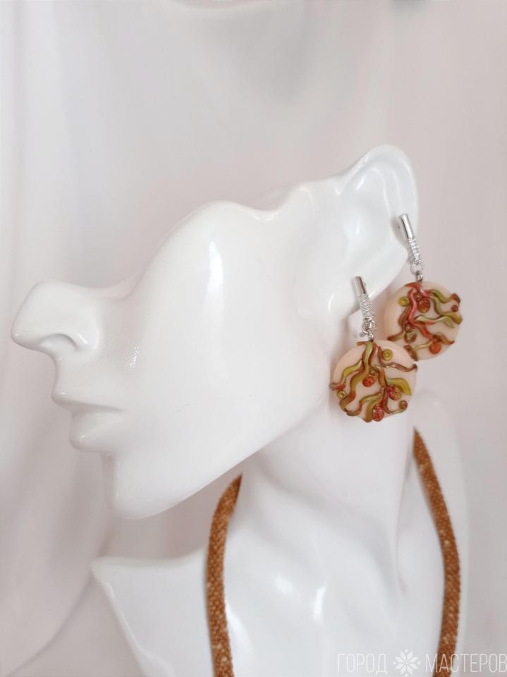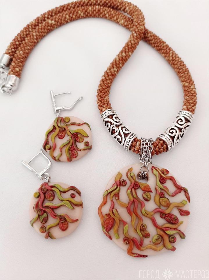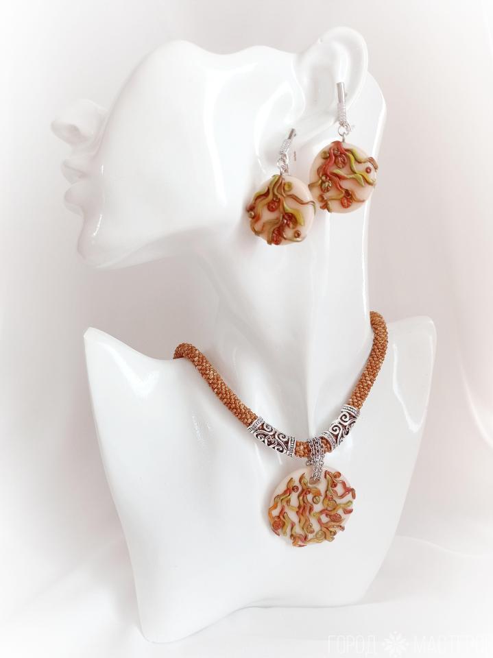 Жгут связан из чешского бисера, длина 45см.Кулон и серьги запекаемая полимерная глина.Без повтора.