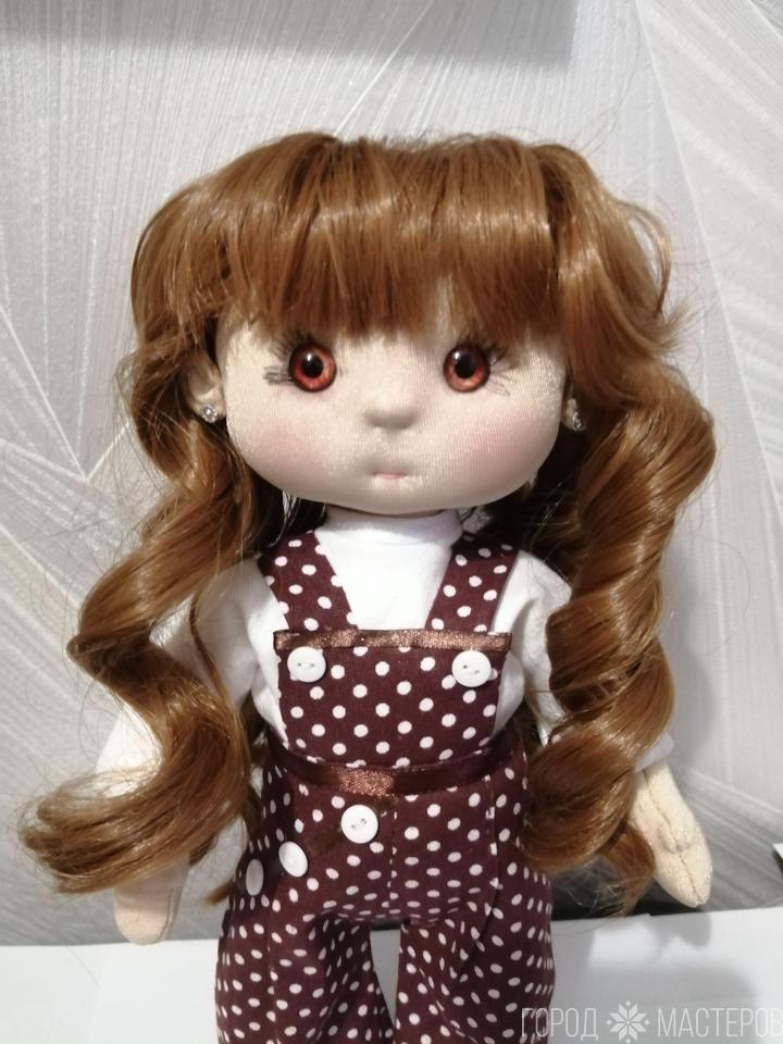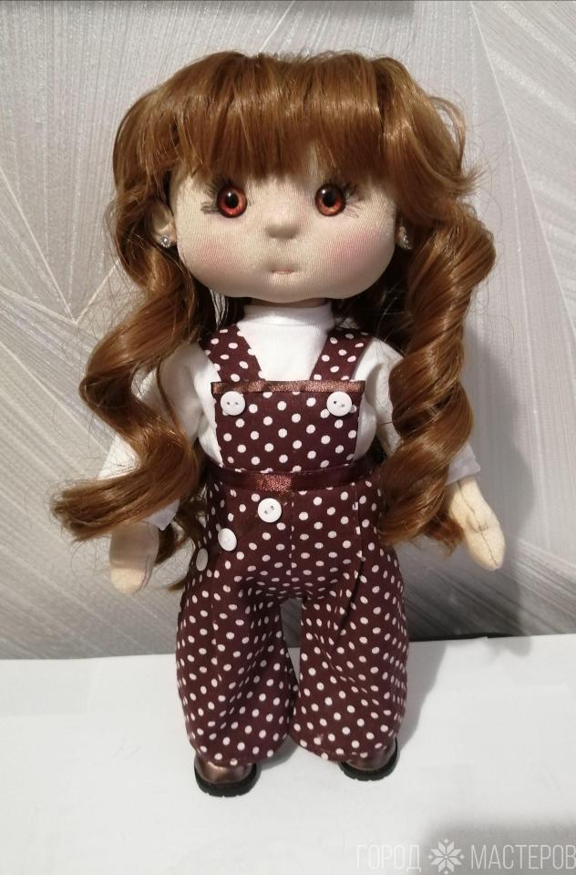 Куколка текстильная, наполнена холлофайбером. Приятно держать в руках, так как мягенькая и легкая. Высота куколки 25-30 см. Юбочка- джинсовая. Одежда не снимается. Высылаю почтой наложенным платежом.