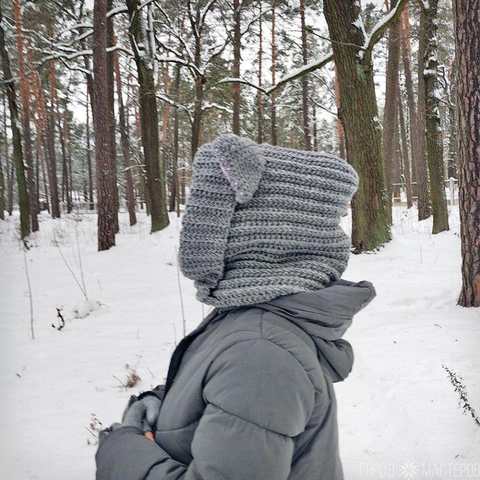Высота 35 см, ширина 29 см. Очень тёплая за счёт полушерстяного верхнего слоя и мягкого, пушистого подклада из петельной пряжи. Верхний слой связан спицами, подклад руками. Шарф для такого капюшона не нужен, потому что боковины снизу сшиты и горло прикрыто. Вес изделия 480 гр.