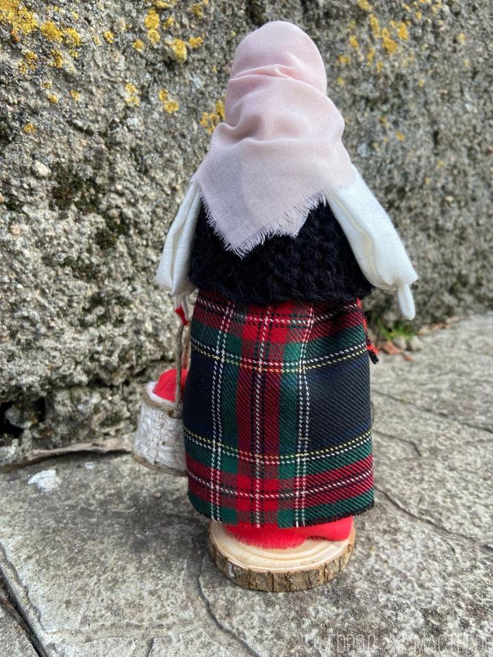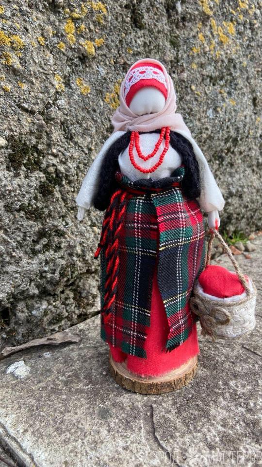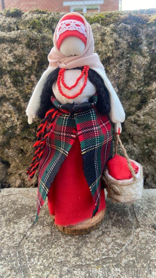 Традиционная народная тряпичная обережная кукла мотанка Берегиня дома смотана на берёзовом поленце из натуральных тканей, стоит устойчиво,размер около 23см