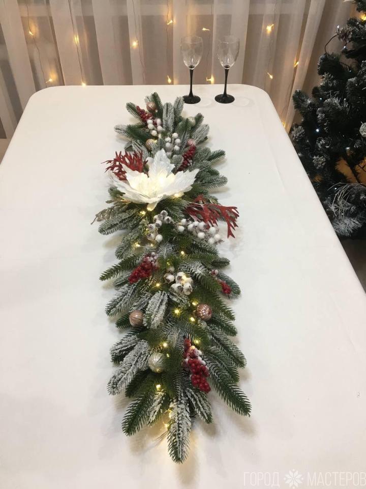 Гирлянда из литой ели, стеклянные игрушки, гирлянда светодиодная "роса", декоративные веточки, искусственные ветки ягод Длина композиции 115см Ручная работа выполнена из качественных материалов