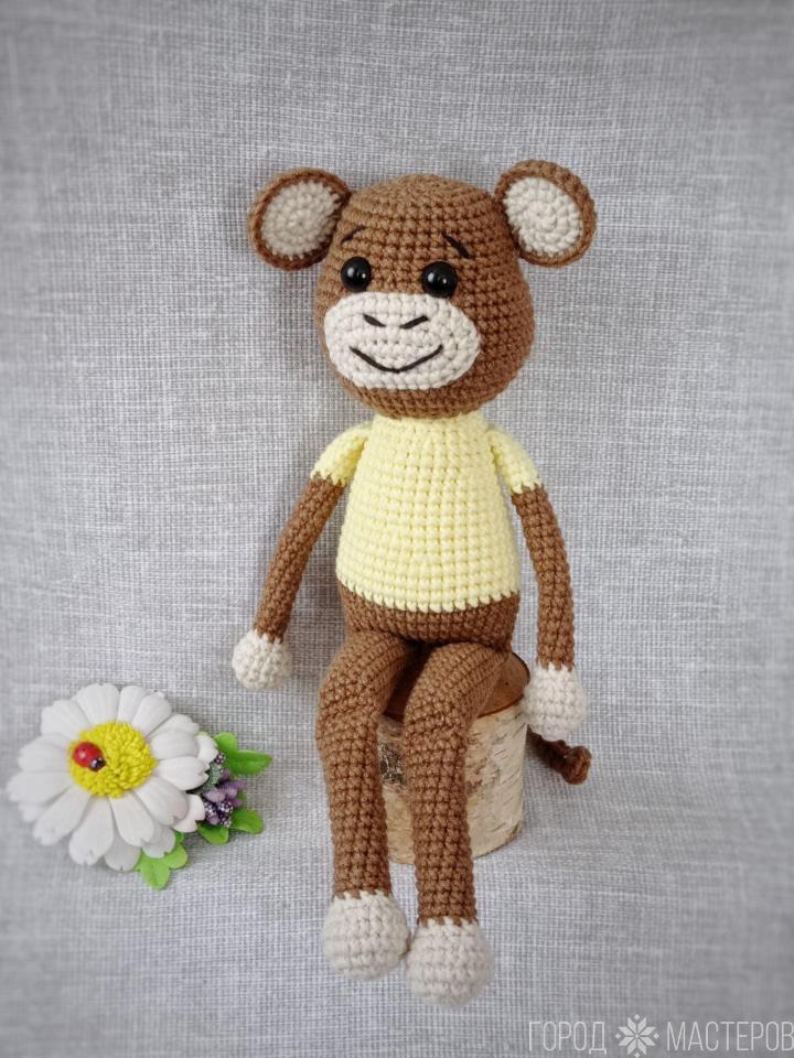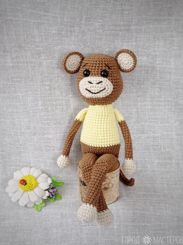 Рост обезьянки 26 см. Связана из детской полухлопковой пряжи, наполнитель холлофайбер. Глазки винтовые.