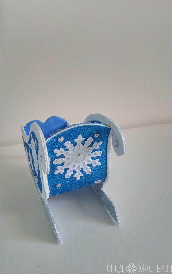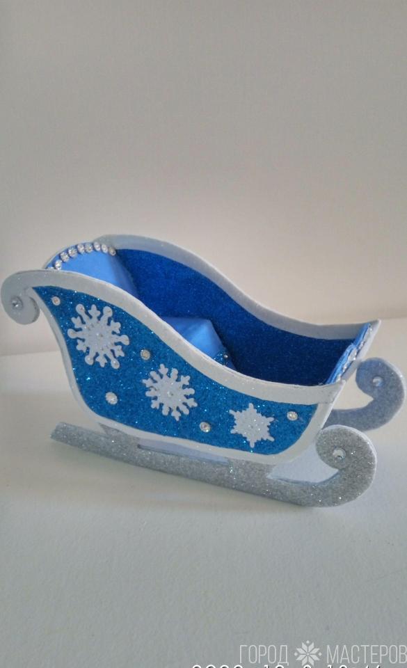 Сани сделаны из пластика и верёвки.Инкрустированы аппликациями и стразами.Довольно вместительныеРазмер 30х12х15Доставлю Белпочтой по РБ.Наложенным платежом в праздничной упаковке.