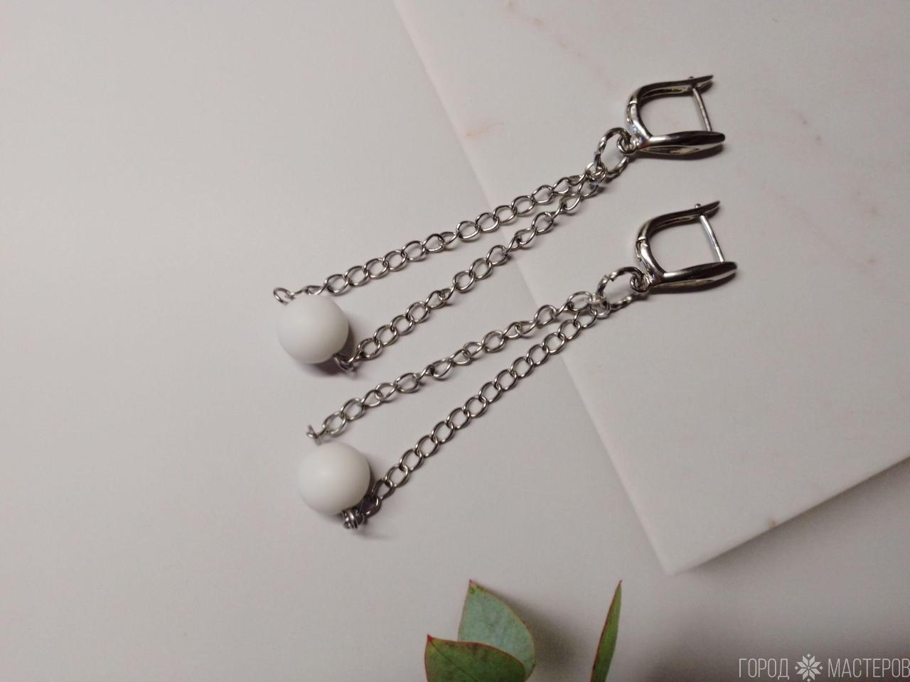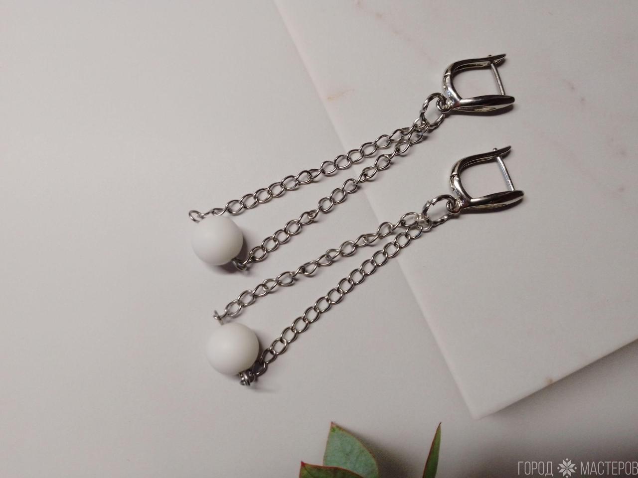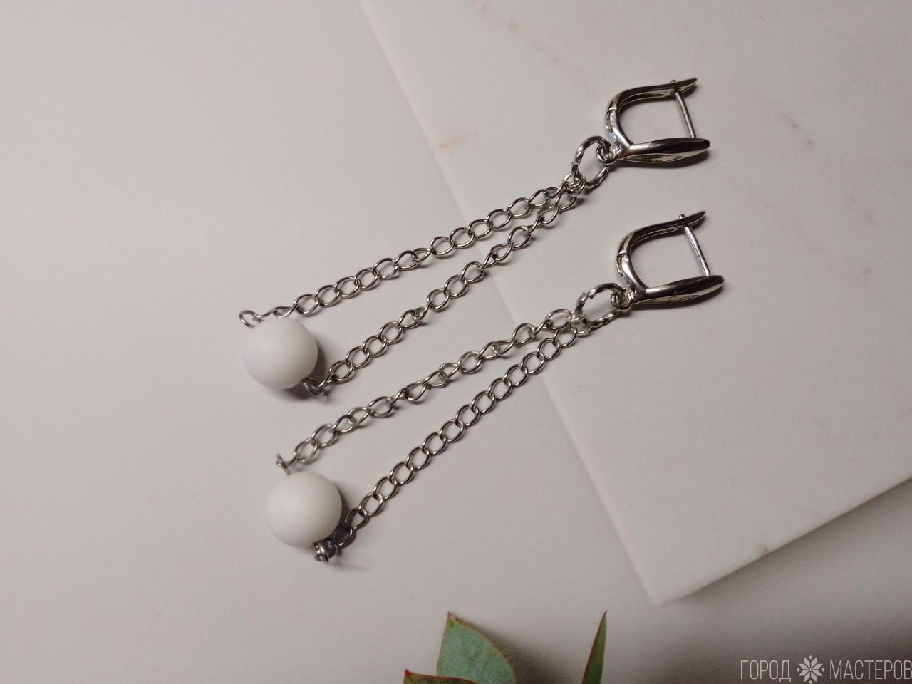 Эти изысканные серьги ручной работы с натуральным белым агатом на цепочках станут прекрасным дополнением вашего образа. Длина серег составляет 7,5 см, что делает их идеальными для вечерних выходов и повседневных образов. Швензы люкс качества, что обеспечивает не только долговечность, но и элегантный вид. Вся остальная фурнитура изготовлена из нержавеющей стали, что гарантирует их стойкость к коррозии и износостойкость.