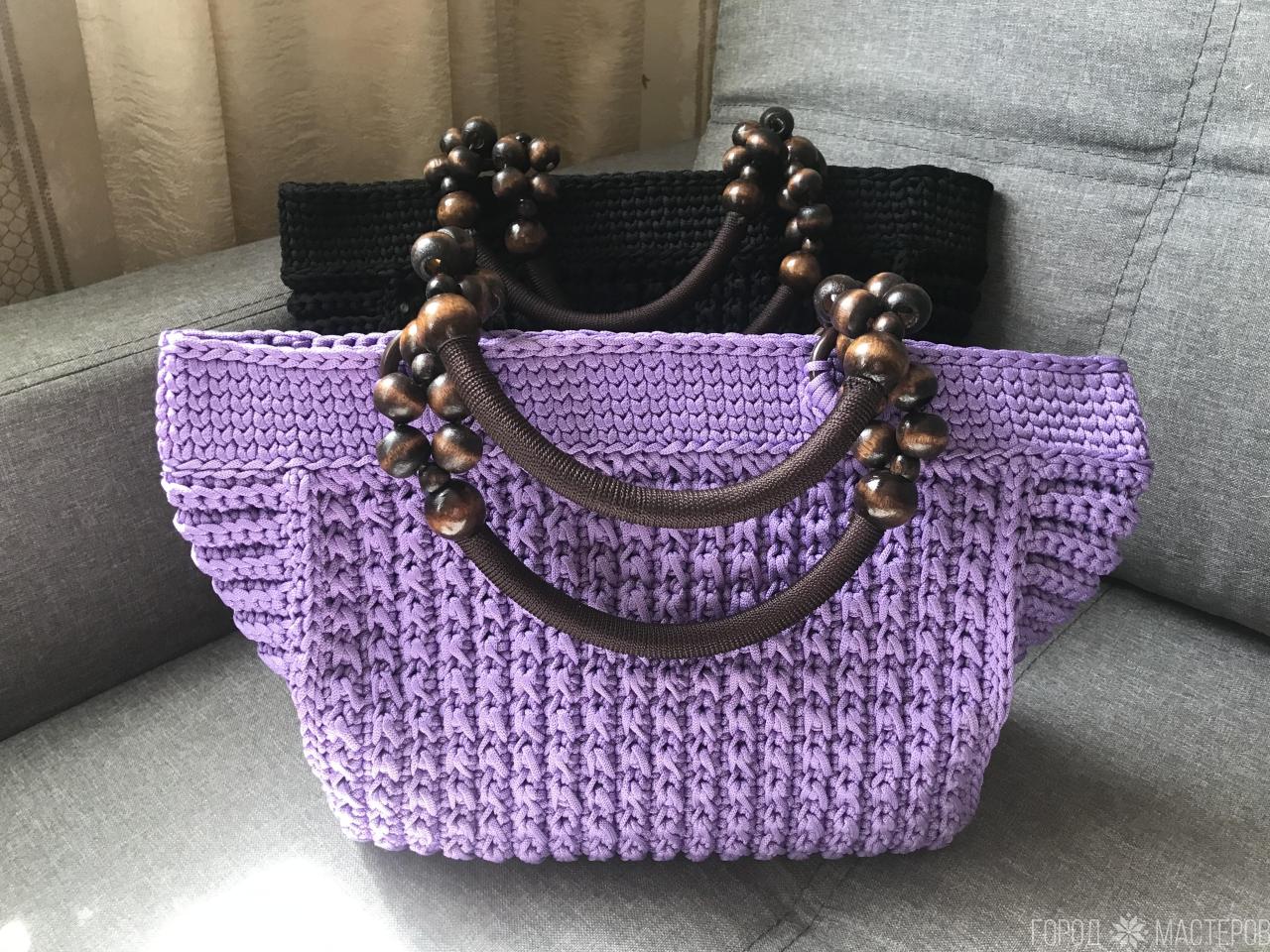 Сумка связана из полиэфирного шнура, ручки с деревянными бусинами, на двух магнитных кнопках, размер сумочки 37*30 см, без подкладки, готовое изделие черного и розового цвета, на заказ можно любого цвета