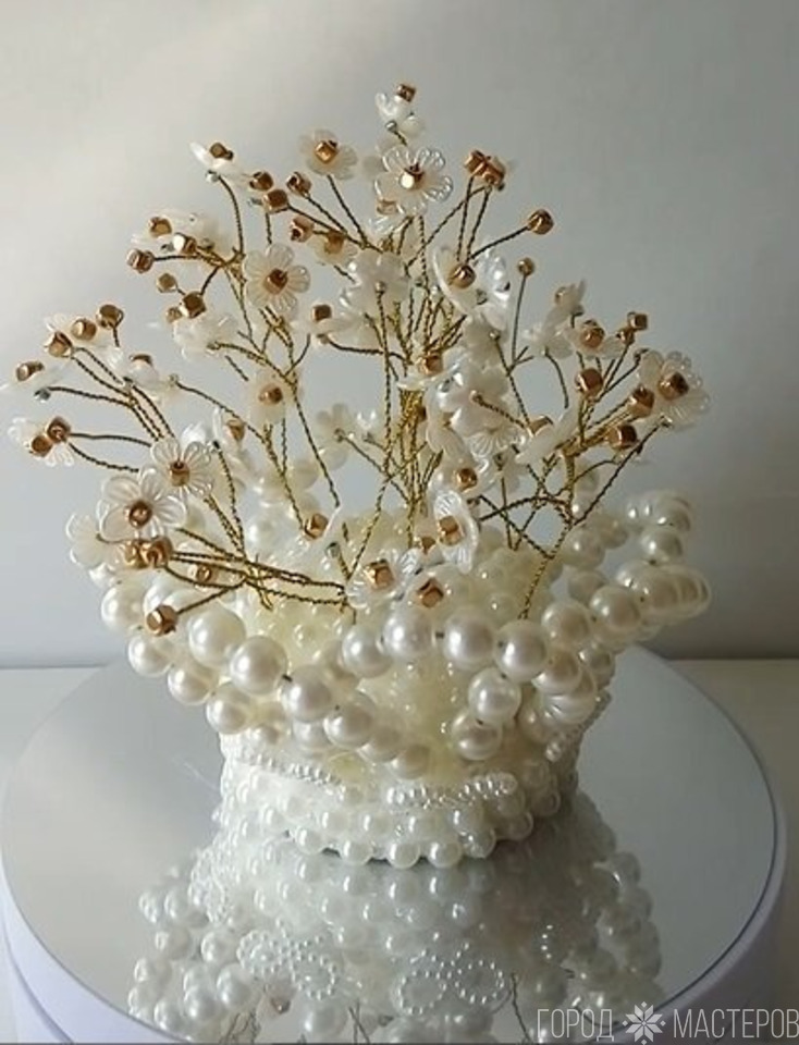 Корзиночка из жемчужных бусин с акриловым цветами и тычинками из бусинок опылённых по золото.