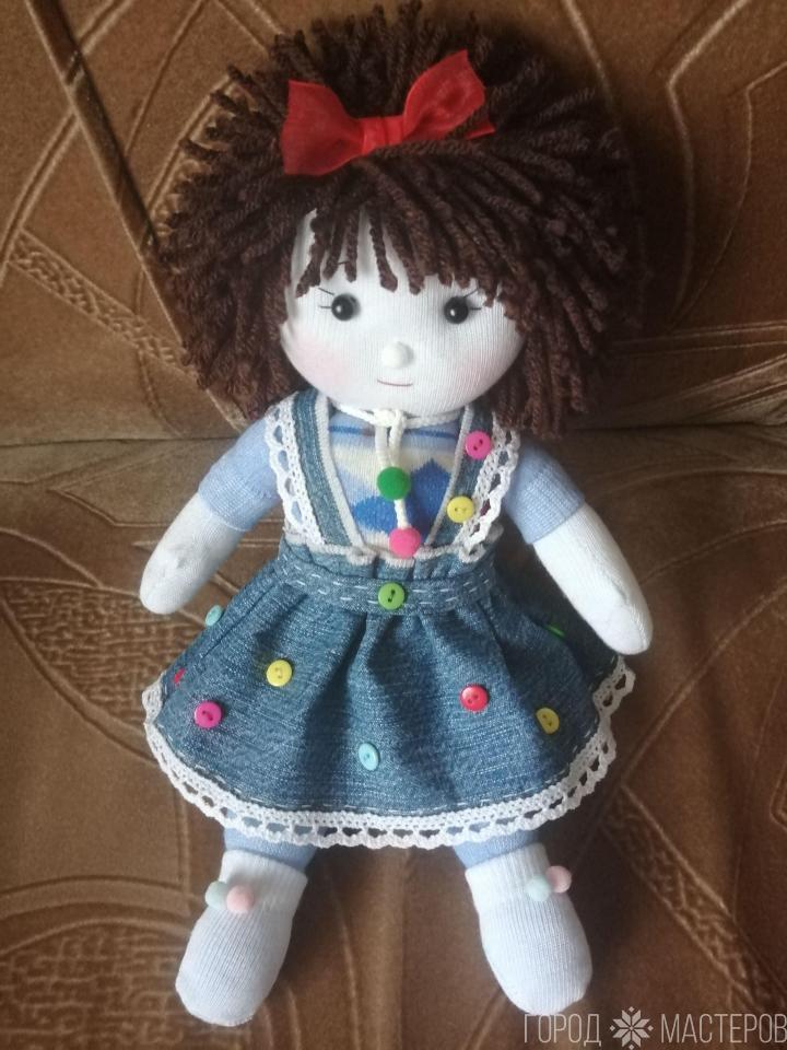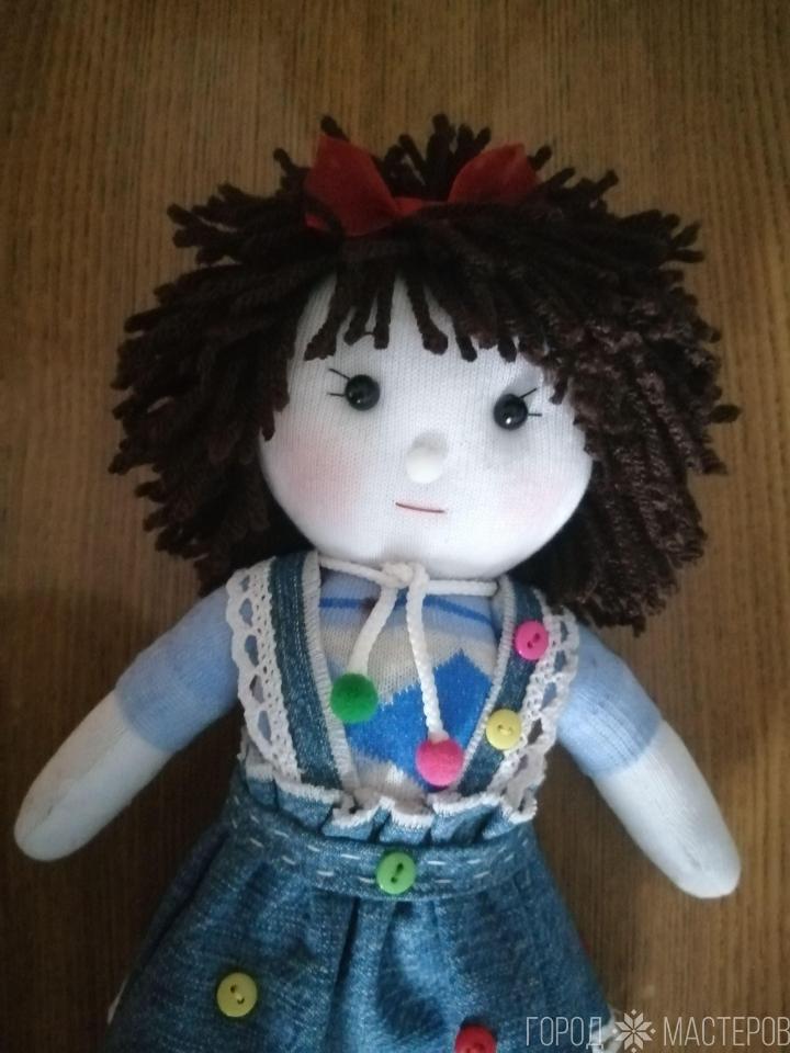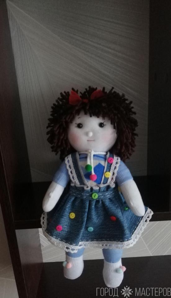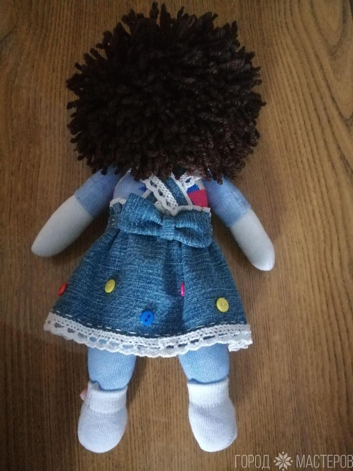 Куколка текстильная, наполнена холлофайбером. Приятно держать в руках, так как мягенькая и легкая. Высота  куколки 25-30 см.  Юбочка- джинсовая.  Одежда не снимается. Высылаю почтой наложенным платежом.