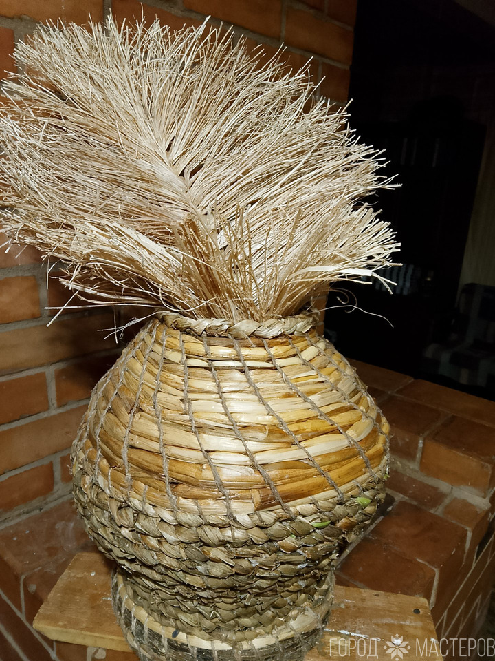 Полностью ручная работа.Высота вазы без букета 18 см. Со вставленным букетом - 35 см.Букет из 3 веточек по 3 цветка на каждой.Цветы и ваза инкрустированы золотой тесьмой.