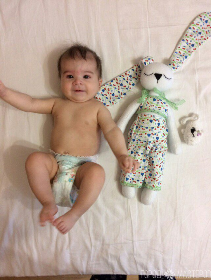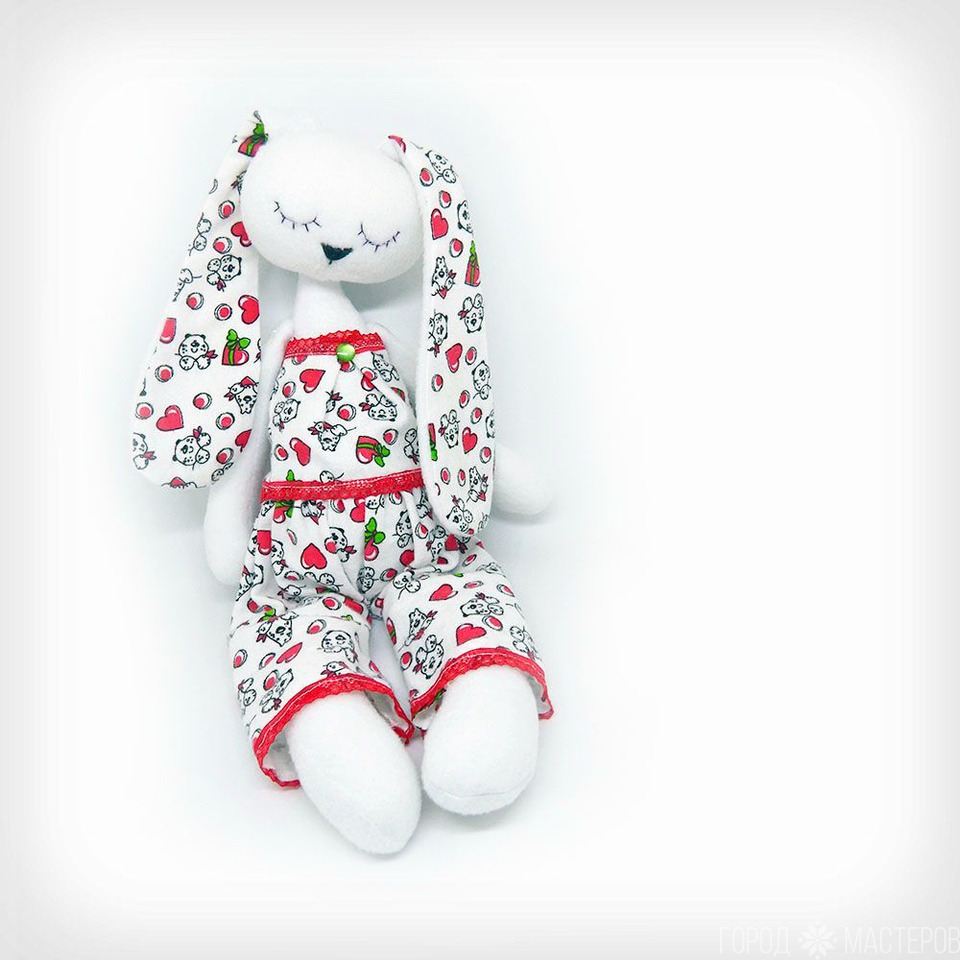 Рост зайки 45 см. Цвет одежды или самой игрушки можно сделать любым (хотя я предпочитаю белый) на ваши вкус и фантазию. Также изменю вариант одежды: например, вместо пижамки сошью платьице.